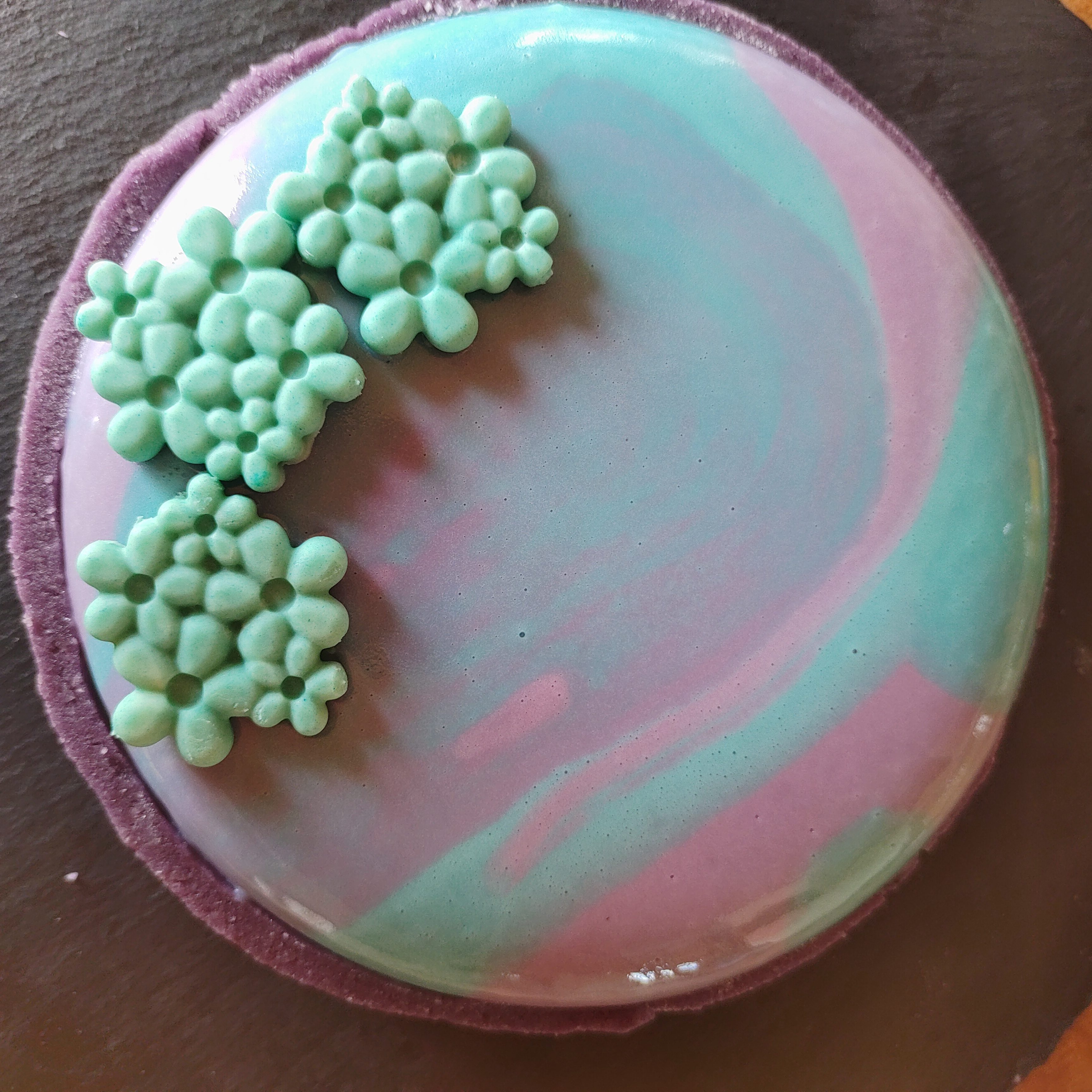 Mirror glaze cakes can be so versatile, made with any crust and any mousse. Our family favorite combinations are almond crust and strawberry mousse, walnut crust and black current mousse, coconut crust and mango mousse. In between the layers of the crust and mousse we love to put some kind of a fruit, berry pure or caramel. And when we use one colored glaze we decorate the finished cake with chocolate, sugar creations and fresh fruits and berries.